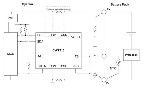 單節鋰電池電量計CW2215的工作電流僅為5μA,是業內最低,內置高精度ADC,支持電壓、電流和溫度監測。芯片內置“FastCali”算法,結合對客戶電池樣品建模測試提取的電池特征參數,可完成對電池剩餘電量(SOC)、循環數(Cycle)和電池健康(SOH)的精確計算,並可配置對低電量、高溫或低溫的情況進行中斷上報。CW2215為WLCSP-9封裝,尺寸為1.58mm*1.53mm。