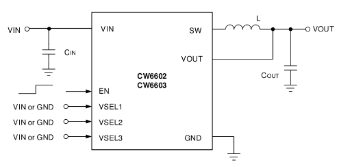 CW6603的功能和尺寸與(yu) CW6602一致,區別是輸出電壓範圍為(wei) 0.6V~1.2V。